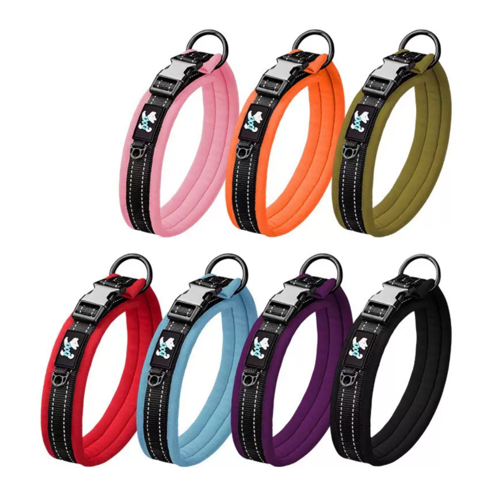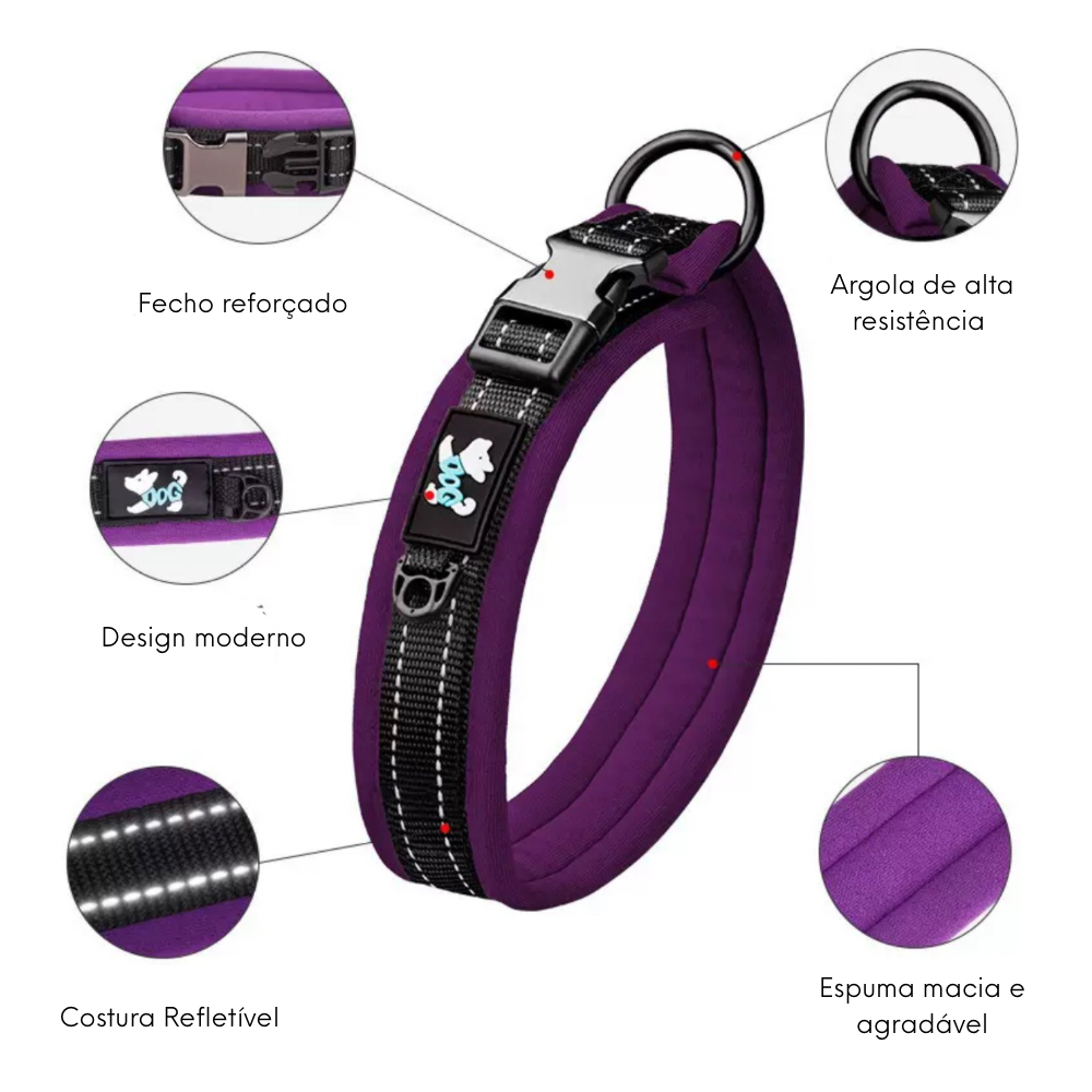Caso não tenha, você pode medir com uma corda, ou até mesmo um papel passando ao redor do pescoço do cão e saber qual a medida do pescoço.