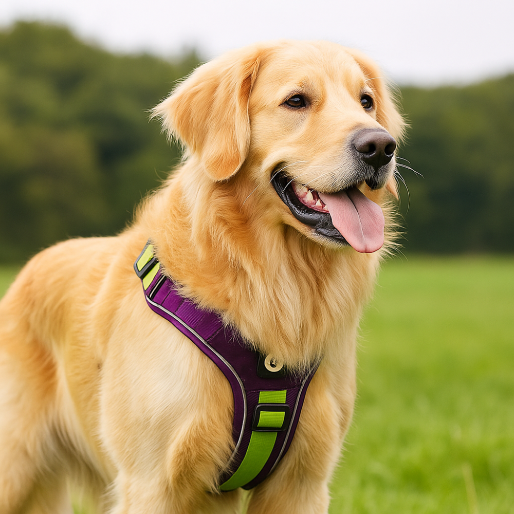 Ideal para cães de médio e grande porte, como o Golden Retriever, esse peitoral transforma o passeio em uma experiência mais leve e segura — com muito estilo.